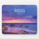 Mousepad mit schönem Foto in lila, blauen und rosa Farbtönen bei Sonnenuntergang. Eine hübsche Küste mit Felsen.