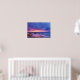 Poster mit einem hübschen Foto in lila, blauen und rosa Farben bei Sonnenuntergang. Eine hübsche Küste mit Felsen.