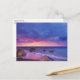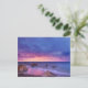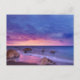 Eine Postkarte mit einem hübschen Foto in lila, blauen und rosa Farbtönen bei Sonnenuntergang. Eine hübsche Küste mit Felsen.