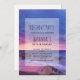 Eine Geburtstagseinladung mit einem hübschen Foto in lila, blauen und rosa Farbtönen bei Sonnenuntergang. Eine hübsche Küste mit Felsen.