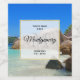 Personalisierte Weinetiketten mit einem Foto eines türkisblauen Strandes mit großen Felsen, die entlang der Küste verstreut liegen. Helle und sonnige tropische Lage. Ein halbdurchsichtiges Quadrat mit einem Imitat mit einer goldenen Folie, die oben mit dem Text überlagert ist.