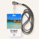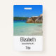 Abzeichen mit personalisiertem Namen und Foto eines türkisblauen Strandes mit großen Felsen entlang der Küste. Helle und sonnige tropische Lage.