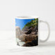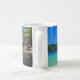 Eine Tasse mit einem Foto eines türkisblauen Strandes mit großen Felsen entlang der Küste. Helle und sonnige tropische Lage.