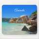Ein Mauspad mit einem Foto eines türkisblauen Strandes mit großen Felsen, die entlang der Küste verstreut liegen. Helle und sonnige tropische Lage.