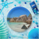Teller aus Papier mit einem Foto eines türkisblauen Strandes mit großen Felsen, die entlang der Küste verstreut sind. Helle und sonnige tropische Lage.