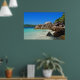 Poster mit Foto eines türkisblauen Strandes mit großen Felsen, die an der Küste verstreut sind. Helle und sonnige tropische Lage.