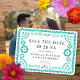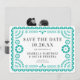 Dieses schöne Papelpikado inspiriert Hochzeit bewahrt das Datum Design mit einem Aqua-verzierten Rahmen und dunkelgrauen Text, weißem Hintergrund und moderne Typografie. Dieses elegante und dennoch moderne Design ist eine fabelhafte Wahl für eine Latinx Hochzeit oder Mexiko-Hochzeit in Urlaubsort. Auf der Rückseite befindet sich das eigene horizontale Foto "Vollblut", das auf Wunsch entfernt werden kann.