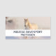 Ein Namensschild mit einem Foto eines wunderschönen weißen Pferdes. Laufen durch ein schneebedecktes Feld. Majestätisch und schön.