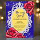 Diese elegante Party Einladung besticht durch ein Beauty- und das Märchenthema "Beast Märytale" auf blauem Hintergrund. Die klassische Beauty und der Märchenbegriff "Be our Guest" werden über den Veranstaltungsinformationen in einem silbernen Glitzer-Spiegel mit gelbem Hintergrund gedruckt. Zwei rote Rosen aus Buntglas erscheinen unten links, oben rechts eine Rose aus Single. Glitzer-Diamanten betonen die obere und untere Portion.