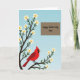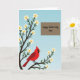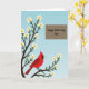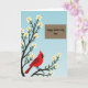 Die Karte ist mit einer sanften Frühlingslandschaft gestaltet und zeigt einen robusten Baum mit dunklen Ästen, die sich auf der linken Seite nach oben erstrecken und mit kleinen weißen Blüten mit gelben Zentren übersät sind 🌼. Vor einem weichen blauen Himmel, der von tieferen zu helleren Tönen übergeht, sitzt ein leuchtend roter Vogel mit schwarzer Gesichtsmaske und orangefarbenem Schnabel auf einem unteren Ast, geneigt, als ob er innehalten würde, um jemanden mit ruhiger Fürsorge zu beobachten ❤️. Die Blüten gruppieren sich um den Vogel herum und verleihen dem Moment ein zartes, kameradschaftliches Gefühl, wie eine ruhige Pause, die zwischen geliebten Menschen geteilt wird. Im oberen rechten Bereich schafft ein ordentliches braunes Rechteck einen klaren Raum für die Nachricht, ohne das Kunstwerk zu überfüllen. Der Text lautet „Happy Mother's Day Omi“, in einer glatten, fließenden Schriftart in einer hellen Farbe, die sich vom braunen Feld abhebt. Das Layout hält den Baum und den Vogel als Hauptschwerpunkt, während die Nachricht bequem zur Seite gerückt ist. Die karmesinroten Federn des Vogels