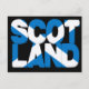 Postkartenbild von "SCOTLAND" in fett gedruckter Schrift, gemischt mit der Flagge von St. Andrew vor schwarzem Hintergrund