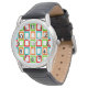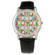 Die Armbanduhr dieses Mannes hat ein modernes Design, in dem sich die Rechtecke in Rot, Orange, Grün und Türkis wiederholen.