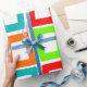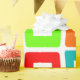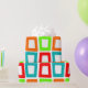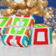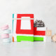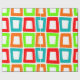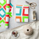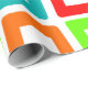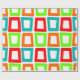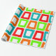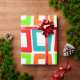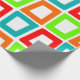 Dieses Verpackungspapier hat ein modernes Design, in dem sich mehrfach verzerrte Rechtecke in Rot, Orange, Grün und Türkis wiedergeben.