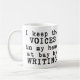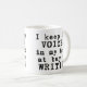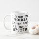 Kaffee-Tassen in einigen Entwürfen, in Farben und in Größen mit der Erinnerung "ich behalte die Stimmen in meinem Kopf an der Bucht durch schreibendes", gutes Geschenk für suthors, Dichter, Stückeschreiber und andere Verfasser, veröffentlicht oder das Streben.