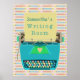 Dieses hübsche Plakatdesign für kreative Schriftsteller / Romanautoren / Journalisten und andere Schriftsteller hat einen hübschen, leuchtend aqua blauen Schreibmaschine gezeichnet. Der Vintage 60er - Schreibmaschine im Stil hat ein Herz in der Mitte und in der Zeitung steht: "Ihr Name" ist der Schreibsaal." Der Hintergrund hat ein helles Farbstift wiederholt Muster mit einem Aquarellfarben / lackierten Effekt. Das ist ein niedliches, modernes Retro-Wandplakat, das an der Wand eines jeden begeisterten Schriftstellers schön aussehen wird.