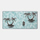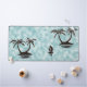 Tropische Szene mit zwei Inseln, jede mit zwei Palmen. Segeln zwischen den Inseln ist ein kleines Segelboot. Bilder sind schwarze Silhouette vor einem wasserblauen, grün grünen Hintergrund.