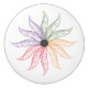 Bunte Federn. Zwölf Federn in vier Farben (jeweils 3 grün, orange, rot und lila) in der Mitte mit einem schwarzen Punkt verbunden.