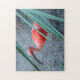Flüchtige Blicke eines Scarlet-IBIS schüchtern heraus von hinten einen niedrigen hängenden Palmenwedel. Sie sind Eingeborene der Karibischen Meere und des Südamerikas