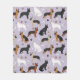 Niedliche Deutsche Schäferhunde in Schwarz und Bräune, Schwarz und Rot, Schwarz und Silber, Weiß und Rücken mit verstreuten Hundeknochen und Pfotendrucken auf einem lila Hintergrund.