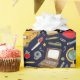 Geschenkpackung für Lehrer oder Schüler oder Party-Dekoration mit Unterrichtsmaterialien und Schulbusmuster.