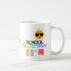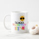 Schulsekretärin in Regenbogenfarben mit fröhlichen Sonnenbrillen-Stifte Noten und Stift.