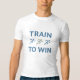 Ein Design für jeden Sportler oder jede Sportlerin, um Sie inspirieren und zu motivieren, härter zu trainieren. Es gibt hier drei Piktogramm-Läufer - der zentrale ist in der goldenen Farbe eines Gewinners - und die Beschriftung lautet "TRAIN TO WIN". Text in dunkelblau. Gut zum Geburtstag, Weihnachten, Glückwunsch.