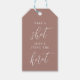 Beginnen Sie das Party mit diesen niedlichen Tags für Junggeselinnen-Abschiede oder Nächte. Design-Features "Schuss, [Name] bindet den Knoten" in klassischen Serif-und Kalligraphie-Schrift Schrift auf einem Erdton Terrakotta Hintergrund.