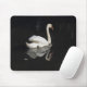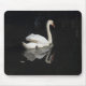 Ein Foto eines weißen Schwans, der über das dunkle, ruhige Wasser gleitet. In Roath Park Lake, Cardiff, Wales.