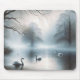 Eine ruhige Szene entfaltet sich mit sanften Schwänen, die über einen nebelbedeckten See unter einem Krondach aus kahlen, verflochtenen Zweigen schwimmen