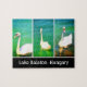 Schwäne am Plattensee - drei Schwäne, die in drei verschiedene Richtungen schauen. Hinter ihnen steht ein grünlich blaues Wasser als Hintergrund .Printed jigsaw puzzle mit der Originalkunst von Alma Wad .