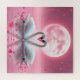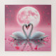 Zwei Schwäne machen ein Herz auf einem rosa See vor einem rosa Mond.