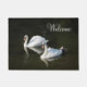 Ein Paar stumme Schwäne gleiten auf dunklem flachem Wasser, eines entspannt mit einem Bein auf der Rückseite.