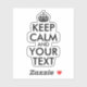 Erstellen Sie Ihr eigenes "Behalt Calm and Your Text" Design auf individuell geschnittenen Vinyl Aufklebern ... 3"x3" Größe. Sie können die schwarze Farbe des Textes und der Krone ändern. Behalt Ruhe und bearbeite deinen eigenen Text.