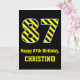Die Vorderseite dieser lustigen und kühnen Geburtstagskarte zeigt eine große Zahl "87" mit einem schwarz-gelben Streifen Muster. Es enthält auch die Meldung "Happy 87 th Birthday", und einen benutzerdefinierbaren Namen. Der Hintergrund der Vorderseite ist schwarz. Im Inneren befindet sich eine individuell anpassbare Geburtstags-Grußnachricht, oder vielleicht kann gelöscht und links werden, wenn eine Nachricht von Hand geschrieben werden soll. Eine personalisierte Geburtstagskarte wie diese ist vielleicht eine lustige Art, Geburtstagwünsche jemandem zu senden, der gerade seinen siebzigsten Geburtstag feiert. [~Z0000382]