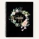 Hübsches Monogramm-Notizbuch mit einem schönen weißen Skriptnamen und einem vergoldeten Initial, der durch eine zarte Aquarellgarland mit floraler Rose auf schwarzem Hintergrund gerahmt ist. Personalisieren Sie sich, um ein besonderes Geschenk zu erhalten! Entwickelt von Thisisnotme©