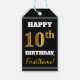 Dieses Geschenk-Tag Design enthält eine Nachricht wie "HAPPY 10th BIRTHDAY, FirstName!", wo der Name angepasst werden kann und wo die Zahl "10th" ein Imitat/Imitation goldfarbigen Aussehen hat. Die Vorderseite hat auch einen schwarzen Hintergrund. Auf der Rückseite befindet sich eine "From:"-Zeile. Geburtstagsgeschenke wie diese könnten vielleicht für Geschenke verwendet werden, die jemand zum zehnten Geburtstag bekommt. [~Z0000202]