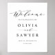 Herzlich willkommen zu Ihrer Veranstaltung mit diesem individuellen Begrüßungszeichen. Es enthält ein schwarz-minimalistisches Skript und eine einfache Typografie. Personalisieren Sie diese, indem Sie Ihre Daten hinzufügen. Dieses kalligraphische Begrüßungszeichen ist perfekt für jedes Hochzeitsthema und jede Hochzeitszeit.