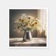 Ein Metallhaken mit einem Bouquet aus schwarz-mit Augen Susan- und Königin Anne's Lace-Blume befindet sich auf einem mit Spitzen bedeckten Tisch, der durch ein mit Spitzen-Vorhängen geschmücktes Fenster mit Sonnenlicht durchströmt wird.