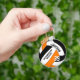 Der personalisierte Volleyball-Schlüsselanhänger mit Teamname zeigt das realistische Bild eines schwarzen, orangefarbenen und weißen Volleyballs, auf dem man den Spielernamen und die Trikotnummer sowie den Schulmannschaftsnamen und den Maskottennamen von katz_d_zynes anpassen kann