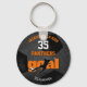 Dieser sportliche Fußball-Schlüsselanhänger mit schwarz-orangefarbenen Mannschaftsfarben zeigt das Wort "Tor" in Orange mit der Silhouette eines Fußballspielers, der einen kleinen schwarz-weißen Fußball spielt, mit dem Namen eines Spielers, der auf die Spielerbezeichnung passt, mit der Nummer aus Weiß und Schule und mit dem Namen eines Maskottchens in Orange, alles mit einer stylisierten Fußballgrafie, die mit einem abstrakten schwarzen Kaleidoskopischen Muster überzogen wurde - von Katz d_zynes