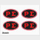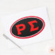 Schwarz-ovaler Aufkleber mit roten Buchstaben.
