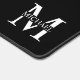 Personalisierte Monogramm- und Name-Fvor-Tags verfügen über personalisierte, weiße Monogramme im klassischen Serif-Schriftart-Stil mit einer Namensbox in der Mitte des Monogramms auf schwarzem Hintergrund.