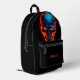 Black Blue Red Skull Flames Modern Monogram Printed Rucksack Ein benutzerdefinierter blau und roter Schädel in Flammen Design auf schwarzem Hintergrund. Sie können die Illustration leicht ersetzen, indem Sie Ihr eigenes Logo, Bild oder Motiv hochladen! Der personalisierte Monogrammname in orange moderner Blocktypografie kann durch Ihren eigenen Namen oder benutzerdefinierten Text ersetzt werden. Die Vordertasche ist schwarz und hat Ihre Textzeile. Das perfekte Geschenk oder Accessoire!