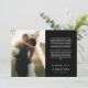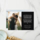 Romantische Hochzeitskarte mit zwei Fotos gedruckt, ein kleineres auf der einen und ein größeres auf der anderen Seite. Vielen Dank und Ihr Hochzeitsdatum in einem feinen, weißen Schriftart mit Ihren Namen in einem romantischen Drehbuch mit einem gedruckten Dankeschön Text oben auf einem schwarzen Hintergrund geschrieben.