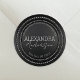 Erhöhen Sie Ihre E-Mail mit diesem atemberaubenden Rücksendelabel. Es zeichnet sich durch einen schlichten, kohleschwarzen Hintergrund aus und schafft eine raffinierte Leinwand für Ihre Details. Die markante Grenze ist ein Ring von glänzenden, silbernen Edelsteinen, erinnert an eine Karo-Reihe. Ihr Name wird anmutig in einem fließenden Skript-Schriftart präsentiert, während die Adresse in einer klaren, knackigen Serife für eine perfekte Lesbarkeit ist. Dieses runde Label ist das ideale Endergebnis für Korrespondenz, das es verdient, sich zu überzeugen.