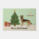 Desteis originelle Cartoon-Illustration eines schwarz-bräunlichen deutschen Schäferhundes. Der Hund wird von einem festlichen Weihnachtsbaum stehend, der mit roten und gelben Ornamenten verziert ist, einer Perlgarage und einem gelben Stern, der auf dem Baumgipfel steht. Es gibt auch zwei Geschenke vom Baum umwickelt und hinter dem Hund gibt es ein braunes Regal mit zwei Kerzen. Der Boden ist beige, die Hintergrundfarbe hellgrün. Es gibt auch einen personalisierbaren Textbereich, der jetzt lautet: "Frohe Weihnachten!".