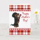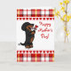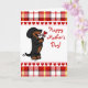 Einzigartige und lustige Dog Art gemalt von Naomi Ochiai aus Japan. Niedliche und lustige Dackel Cartoon Geschenkartikel für Dackeln Fans!! Ein bezaubernder Schwarz- und Tan-Smooth-Dackel-Welpe gibt seiner Mama seine winzige Blume. Sie können Text und mehr anpassen! Muttertagskartendesign mit karierten und winzigen Herzen in Rot und Weiß.