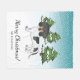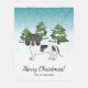 Desteis originelle Cartoon-Illustration einer bezaubernden kurzen Haar schwarz und tan piebald Fell Farbe Dackel züchten Hund. Der Hund ist in einer Winterlandschaft mit drei grünen Tannenbäumen und fallendem Schnee untergebracht. Der Hintergrund ist ein blaues bis weißes Gefälle, das das Design des kalten Wintertages verleiht. Es gibt auch einen personalisierbaren Textbereich, der jetzt "Frohe Weihnachten!" in einem schönen Script-Schriftart liest. Darunter befindet sich ein weiterer personalisierbarer Textbereich für einen Familiennamen oder einen anderen benutzerdefinierten Text.