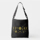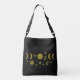 Dieses Design zeigt eine harmonische Mischung aus himmlischen und botanischen Motiven, die in schimmernder Goldfolie vor einem tiefschwarzen Hintergrund dargestellt sind. In der Mitte befindet sich ein strahlender Vollmond, flankiert von symmetrisch angeordneten Mondphasen, die den Rhythmus der Mondzyklen evozieren. Die himmlischen Elemente sind von zarten Verzierungen umgeben: blättrige Zweige, eine stilisierte Blume, ein Herz und ein einzelner Punkt - jeder trägt zum Gefühl von Ausgewogenheit und organischer Eleganz bei. Die Komposition ist visuell zentriert und durchdacht angeordnet, wodurch ein Gefühl von Ruhe und kosmischer Verbundenheit entsteht. Die Goldfolientextur verleiht Tiefe und Luxus.