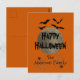 Senden Sie ein Halloween-Gruß mit dieser lustigen Halloween-Typografie mit Fledermäusen und Spinnen und einem Schatten Vollmond mit Familiennamen auf orangefarbenem Hintergrund.
